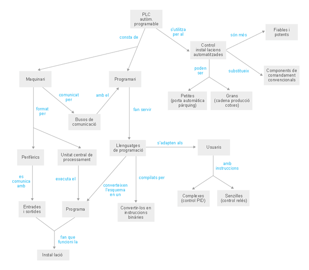 El PLC, l'autòmat programable, substitueix en el quadre de control els elements com relés, temporitzadors, etc., que defineixen les condicions de l'automatisme o algoritme de control.