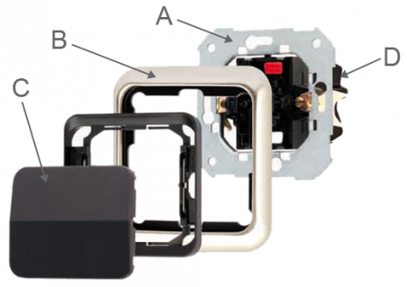 Els cables s’han de connectar al mecanisme (D) i aquest s’ha de col·locar al bastidor metàl·lic (A), afegir-ne el marc (B), i finalment la tecla o tapa (C). Aquest últim element és el que està a l’abast de l’usuari i és el que està al nivell de la superfície. L'esquema complet de la instal·lació es pot veure a la figura 2.
