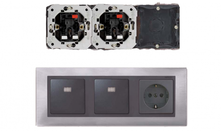 Per a polsadors, interruptors, commutadors, commutadors de creuament i preses de corrent, l’estructura de muntatge encastada varia molt en funció del fabricant i del model. De manera genèrica, consta de les parts següents: