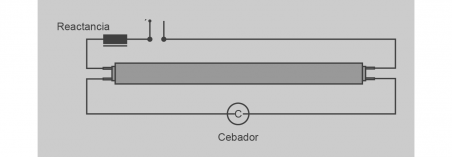 La diferència de potencial queda aplicada per mitjà de la reactància i en sèrie amb els filaments del tub. L’encebador va connectat en paral·lel amb el tub. A l’interior de l’encebador, el gas neó es comença a escalfar perquè el gas s’ionitza. Com que l’atmosfera de l’encebador s’escalfa, les làmines bimetàl·liques es corben i s’arriben a tocar. Quan l’encebador té les làmines en contacte, té el circuit tancat i fa que el corrent circuli pels filaments del tub, fet que provoca l’emissió dels electrons, que en xocar amb els àtoms de gas que conté el tub, desplacen de les seves òrbites els electrons del gas ionitzat i absorbeixen energia. Passats uns instants, els electrons desplaçats tornen a la seva posició inicial i alliberen l’energia presa amb anterioritat, en forma de radiacions, principalment ultraviolades.