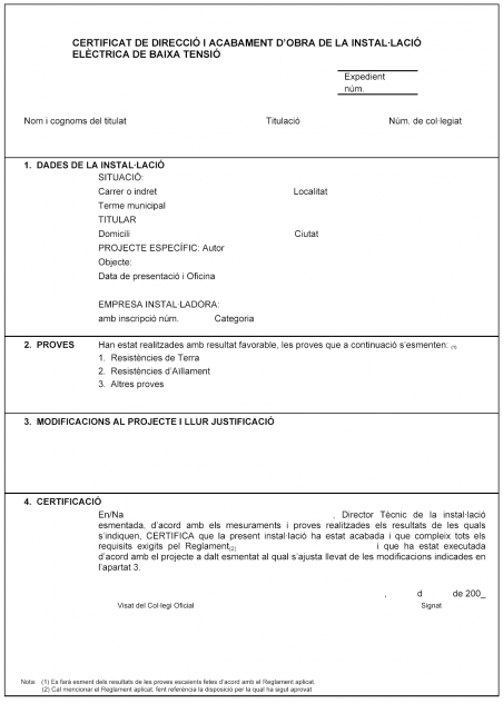 Model ELEC 4. Certificat d’acabament d’obra de la instal·lació elèctrica de baixa tensió