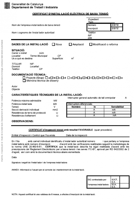 Certificat d’instal·lació elèctrica de baixa tensió