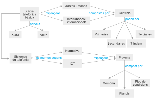 En la unitat “Sistemes de telefonia” estudiem en un principi les diferents xarxes que hi ha en telefonia (urbana, interurbana i internacional) amb les respectives centrals de commutació (primària, secundària, tàndem, terciària i internacional).