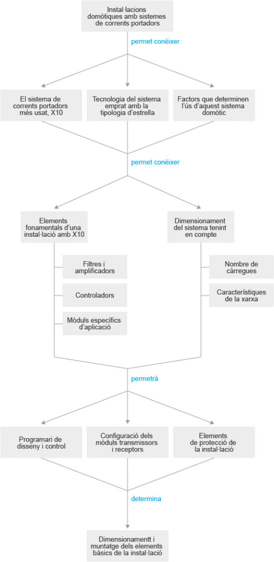 Els elements necessaris pel funcionament d’una instal·lació domòtica amb sistema de corrents portadores passa primer per tractar la senyal i garantir un mínim de seguretat en la comunicació entre aparells. Els aparells més rellevants els tractarem com a dos grans blocs: els controladors i els mòduls. Així doncs, farem la següents classificació: