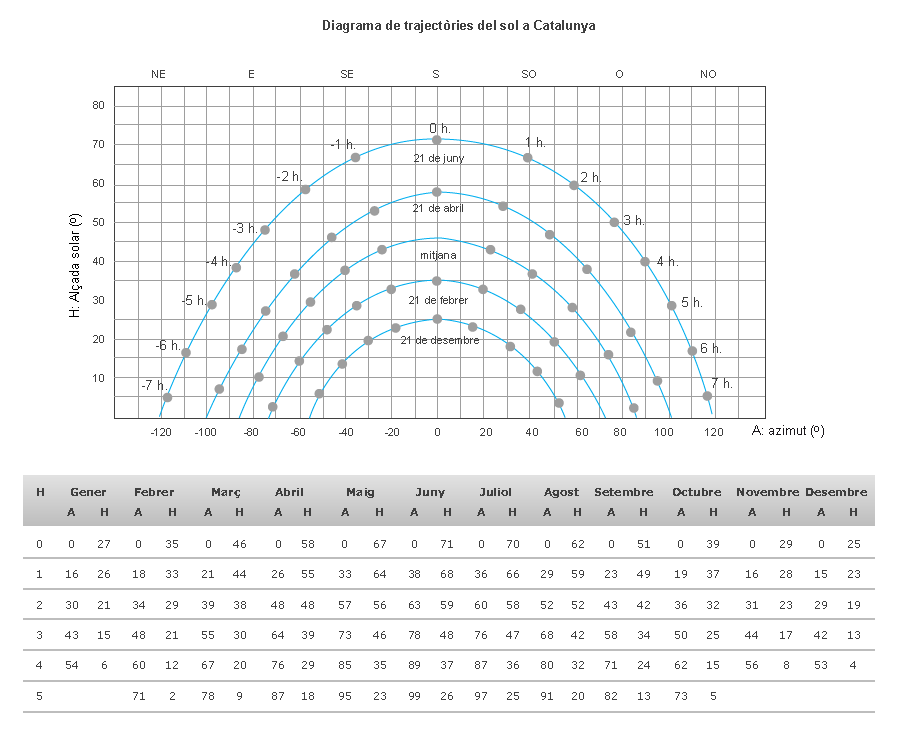 Representació gràfica de l'arc solar a Catalunya (inclinació i orientació cada hora per a tot l'any) amb una taula indicativa de les coordenades solars per a tot l'any. És un recurs útil a l'hora d'avaluar l'ombra incident d'un obstacle concret.